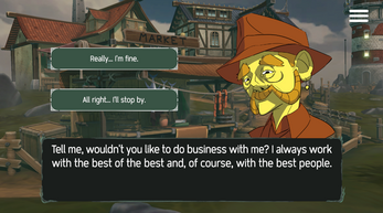 Wooooo the story is so catchy i love it. Also the characters are so diverse and I enjoyed talking with them all. I really liked that you didn't try and do the same generic storyline that you cna find anywhere and try and give it your own personal touch with this fishing story and that incredible visual style. My favourite one at this moment.