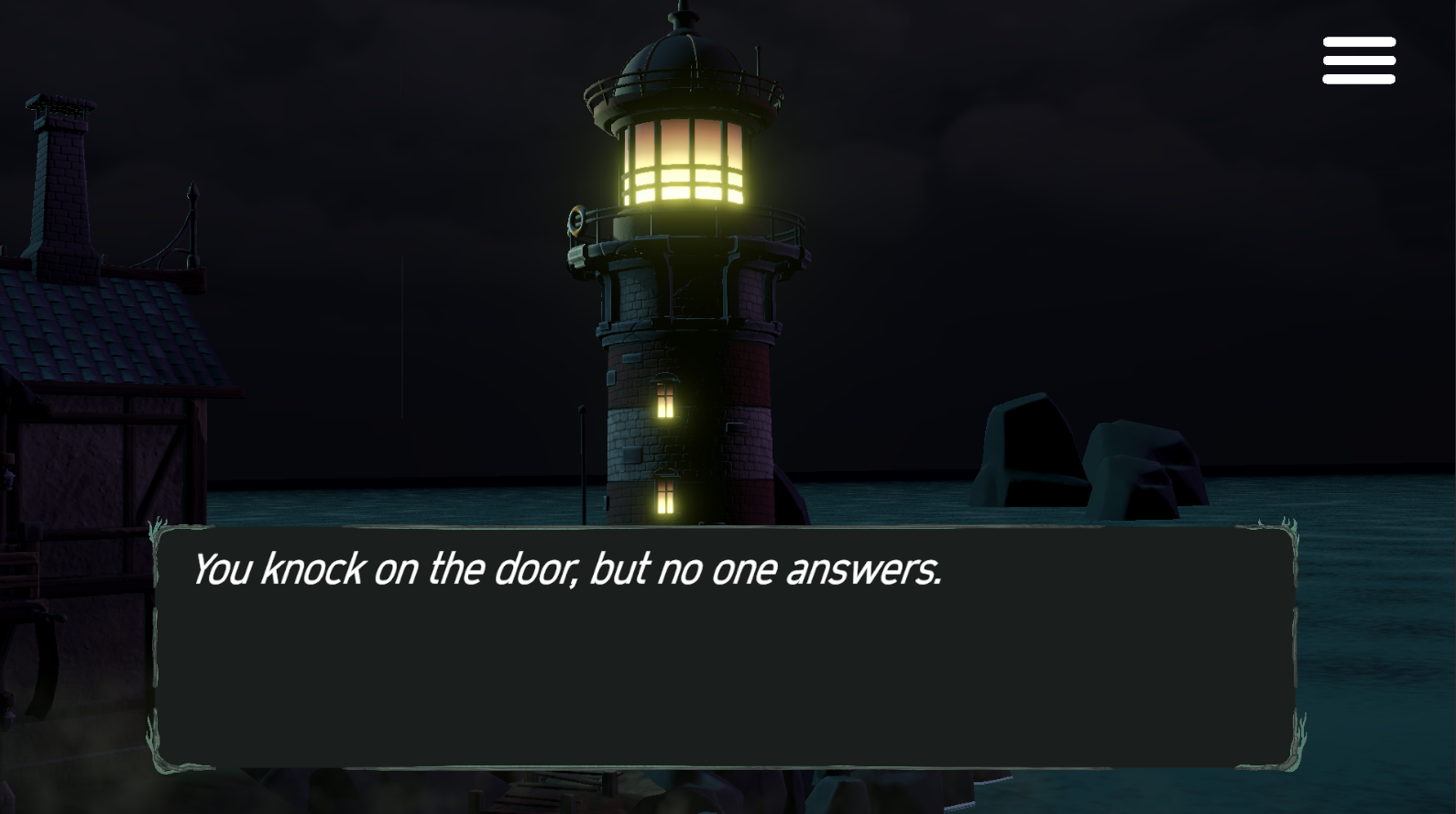 Habiendo dicho esto, me sorprendió que para un juego de un jam de un mes, hayan creado estos espacios 3D y los personajes están bien desarrollados. La ambientación me recordó a la prosa de los pueblos cercanos al mar que alguna vez escribió Lovecraft. Supe que algo estaba mal desde que los peces atrapados venían de todos los mares y profundidades imaginables; lo que pude ver de la trama me gustó. ¡Felicidades!