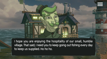 Well, well, who do we have here? The promising young sea fisherman that everyone is talking about. Well, at least the handful of residents in this old town are, ha ha ha. I know you're a city boy, but I'm sure you'll get used to the quiet town life. I hope you don't lose your mind like our former fisherman, okay?
